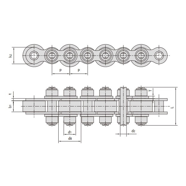 - Groß- und Kleinrollendesign:Die erste Rolle hat einen Durchmesser, der größer ist als die Höhe der inneren Kettenplatte, sodass ihre Außenfläche über das Ende der Kettenplatte hinausragt. Die zweite Rolle ist kleiner und hat einen Durchmesser, der kleiner ist als die Höhe der inneren Kettenplatte.