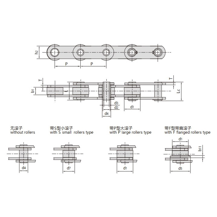 - Erhältlich in einer rollerlosen Ausführung oder ausgestattet mit kleinen Rollen vom Typ S, großen Rollen vom Typ P und Schulterrollen vom Typ F für unterschiedliche Antriebsanforderungen.